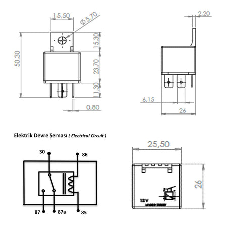 Dieses 12-V-Mini-Relais mit 5-poliger Konfiguration ist eine vielseitige und unverzichtbare Komponente für verschiedene Automobilanwendungen. Es besteht aus hochtemperaturbeständigen, flammhemmenden Materialien und gewährleistet Haltbarkeit und Zuverlässigkeit unter extremen Bedingungen.